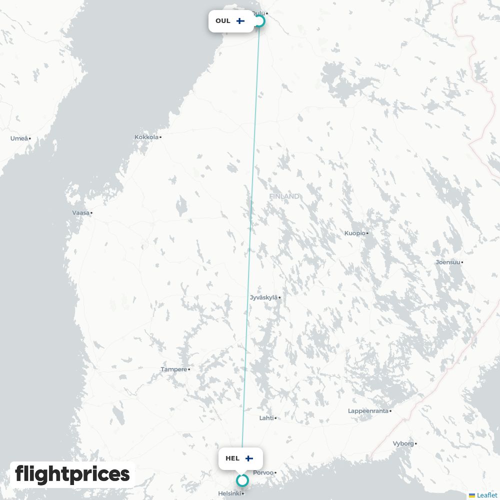 Pikakatsaus reitille Oulu (OUL) – Helsinki (HEL) — alin ja tyypillinen hinta, hintahaarukka, edullisimmat kuukaudet ja viikonpäivät, reittiä operoivat yhtiöt sekä tavanomainen kesto.