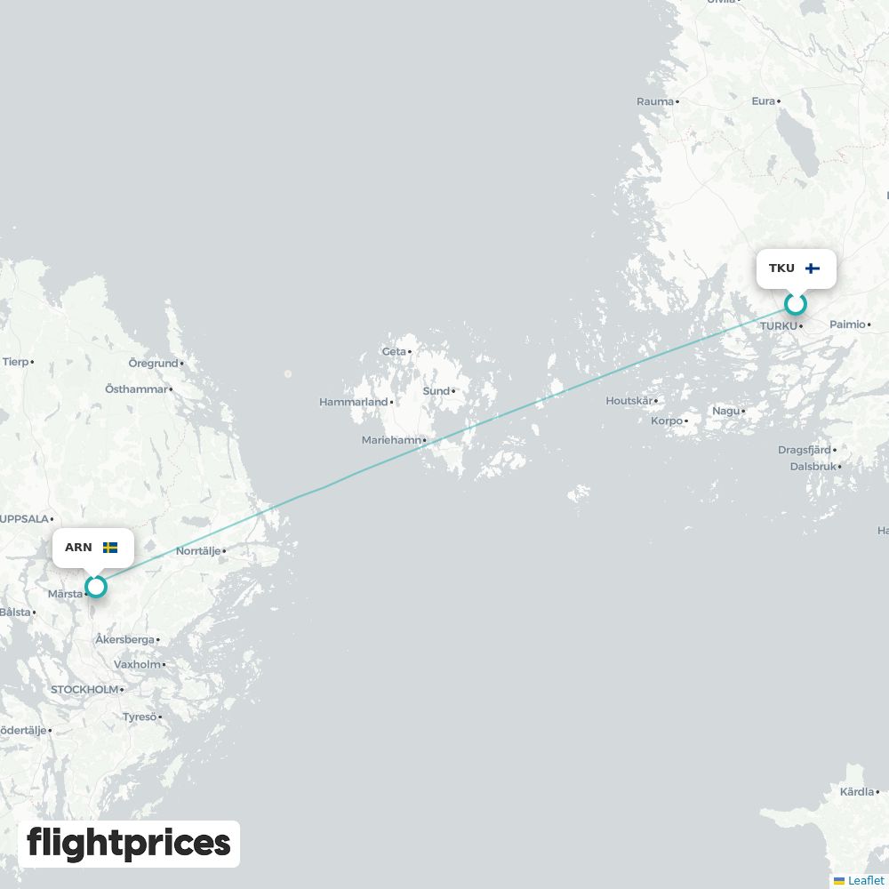 Pikakatsaus reitille Turku (TKU) – Tukholma (ARN) — alin ja tyypillinen hinta, hintahaarukka, edullisimmat kuukaudet ja viikonpäivät, reittiä operoivat yhtiöt sekä tavanomainen kesto välillä Suomi ja Ruotsi.
