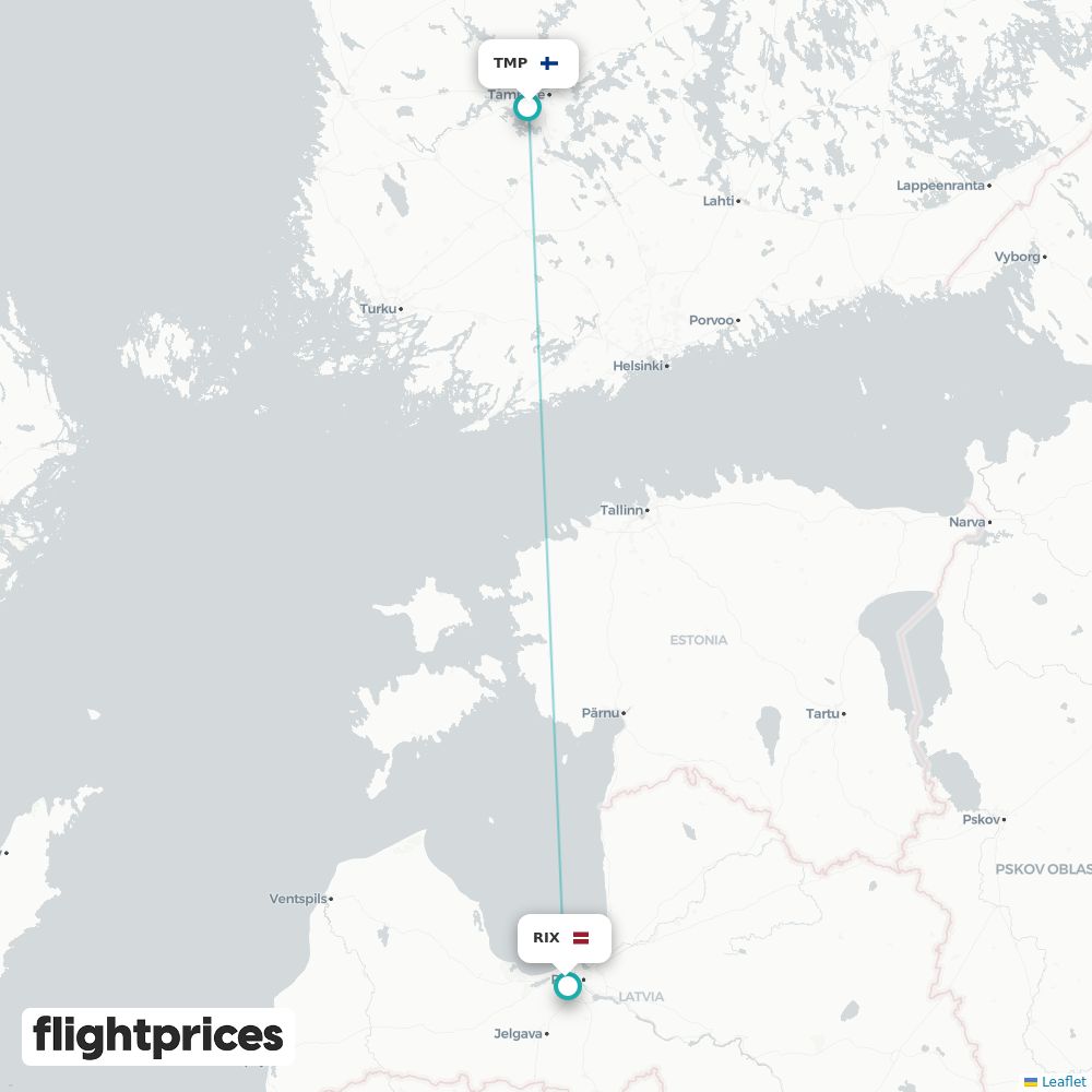 Pikakatsaus reitille Tampere (TMP) – Riika (RIX) — alin ja tyypillinen hinta, hintahaarukka, edullisimmat kuukaudet ja viikonpäivät, reittiä operoivat yhtiöt sekä tavanomainen kesto välillä Suomi ja Latvia.